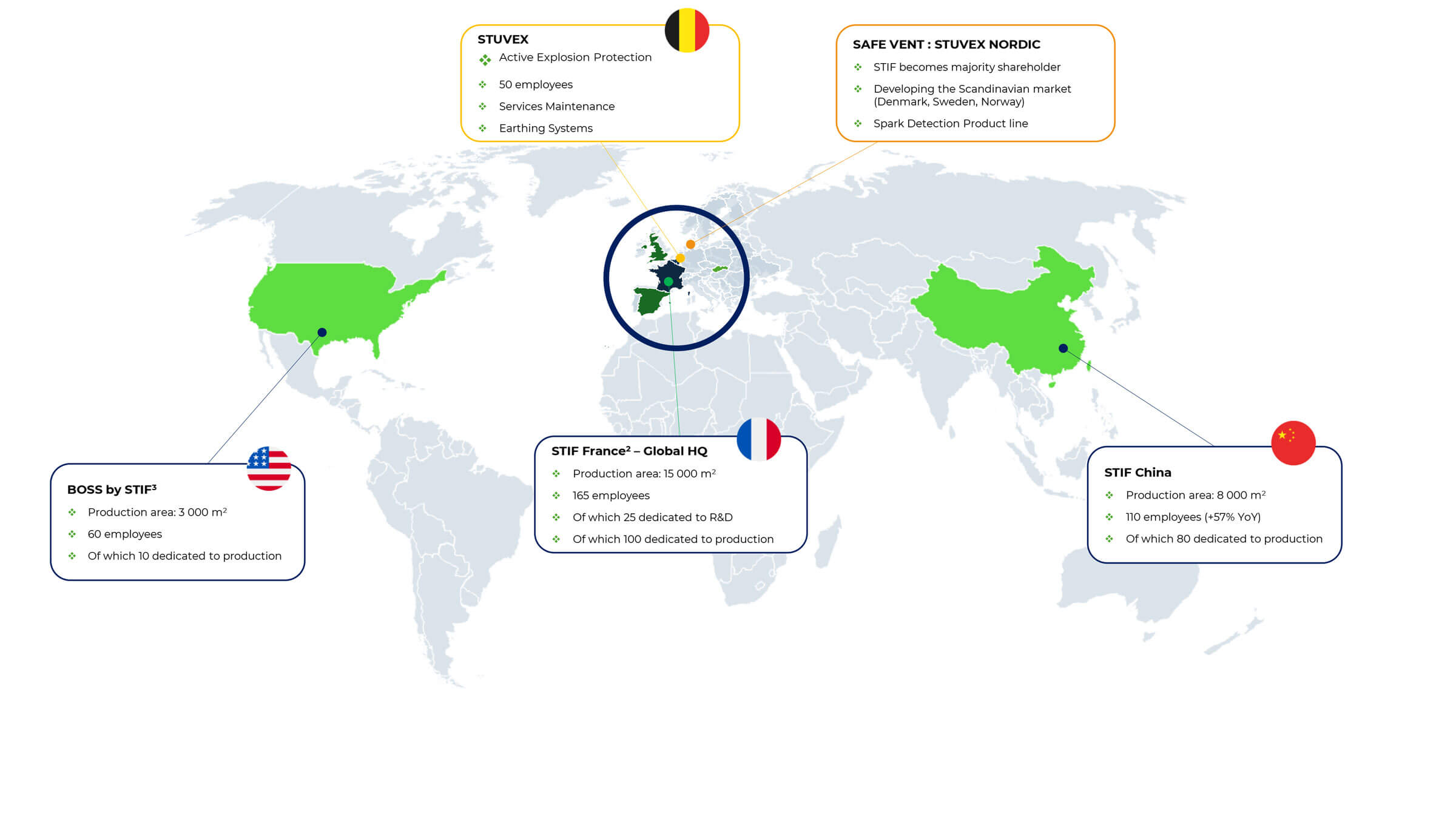 With internationally certified and referenced product ranges, a robotic production tool adapted to the manufacture of large series on 3 continents and a global sales network established with major clients, the Group intends to become a global player in industrial and energy security, in Europe and internationally .